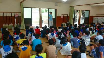 活動の拠点となる90畳の部屋に入り,オリエンテーションを行っています。みさきの家の方からみさきの家での過ごし方,寝具の使い方,トイレの使い方などを教えていただきました。
