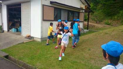 ウォークラリーの様子です。みさきの家の自然を観察しながら所内を探検しています。京都に比べて涼しいようですが,雨が心配です。