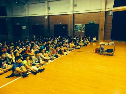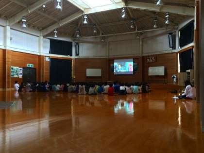 雨のため,きもだめし下見は中止になりました。プレーホールでDVD鑑賞をしています。