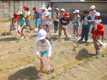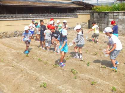 今日は2年生の1学級が水やりに行きました。一人一人が学校でペットボトルに水を入れ,地域の方に貸していただいている畑まで歩いて行きました。畝ごとにグループで分かれて水やりをしました。次の水やりに行く時にどれだけ成長しているか楽しみです。