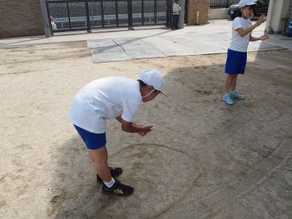 笛の合図で,次はペアでキャッチボールをします。1バウンドでしっかりキャッチできるように声をかけあっています。