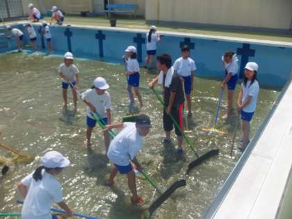 今日の1校時から3校時まで6年生児童がプール掃除をしました。4校時には5年生もプール掃除をしました。6年生はクラスごとに分担を決めて1時間ずつ取り組みました。