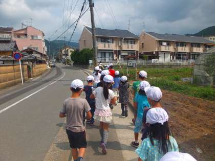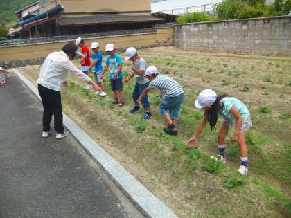 今日1校時に2年生の一クラスがサツマイモの水やりに行きました。学校から地域の方からお借りしている畑まで歩いて行きました。子どもたちは,グループごとに違う列に分かれて自分の分担の場所に水をやりました。
