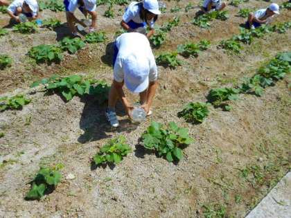 2年生は1年生とともに順番にサツマイモの水やりに行っています。今日も1クラスが水やりと雑草抜きに行きました。