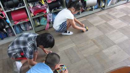 モーターのつけ方を工夫して電池で動く車を走らせました。