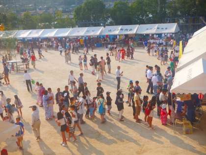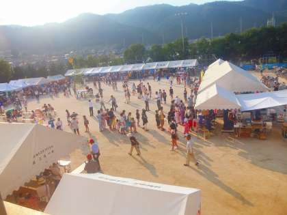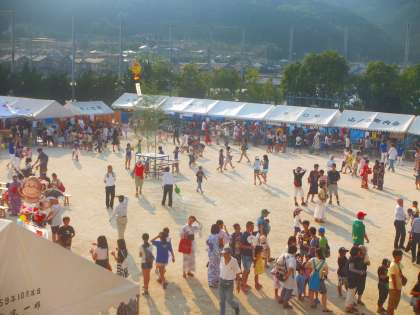 運動場を主会場に地域の諸団体や町内会のブースがあり,大勢の人がまつりに参加しています。
