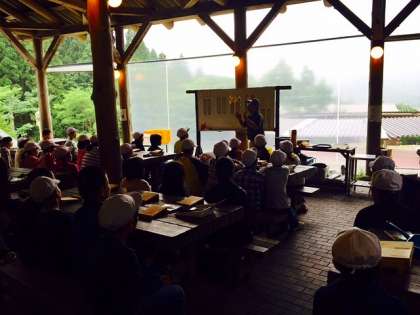 雨が降ってきました。炊事場に移動して竹箸作り開始です。