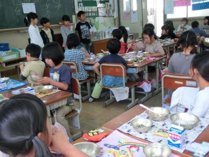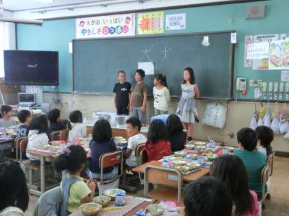 国語科で「つたえよう,楽しい学校生活」を学習しました。班で話し合った学校行事について給食の時間に1年生に紹介しました。1年生を目の前にして,緊張しています。