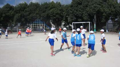 チームで協力してパスをまわしたり,作戦を考えたりと力を合わせて頑張っています。