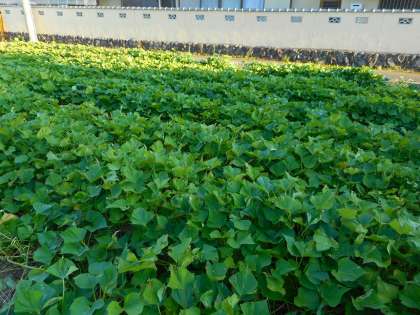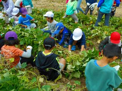 2年生は,1年生と一緒に地域の方に畑をお借りして,6月からサツマイモを育てています。いよいよ収穫の時期を迎え,14日にはみんなでつる切りをしました。