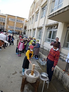 本日,地域の方々や保護者の方々に支援していただき,無事餅つきをすることができました。もち米から杵でトントンし,つぶして餅にしていく様子を見学させていただいたり,実際に杵を持ち,ぺったんしたりしました。おいしいお餅ができ,たくさん食べられました。