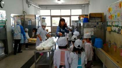 1年生の給食当番児童は,担任の先生と一緒にサービスホールに行き,今日の給食を受け取って教室まで運びました。