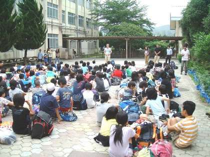 6年生全員が,自然体験学習に出発しました。写真は本校中庭での出発式の様子です。