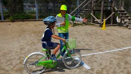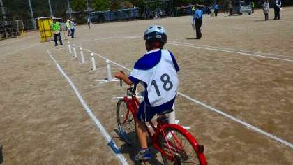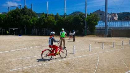 朝早くから北警察署や地域の方に学校に来ていただき,運動場で練習や試験のためのコースを作っていただきました。4年生はクラスごとに運動場に出て,自転車に乗りました。