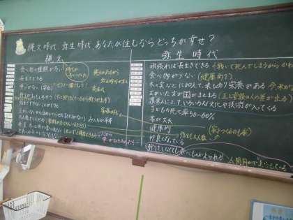 社会科の学習で,6年生では歴史の学習がはじまりました。縄文時代,弥生時代について学習してきた子どもたちは,自分がタイムスリップするならどっちが幸せに住めるかを真剣に討論していました。