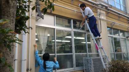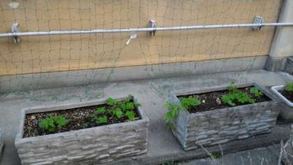 今年も本館南側の壁沿いで緑のカーテンを作ります。園芸委員会の児童がゴーヤの種を植えたものが育ってきています。昨日は,壁沿いに園芸担当の先生たちがみどりの網を張りました。夏に向けてみどりのカーテンができていくのが楽しみです。