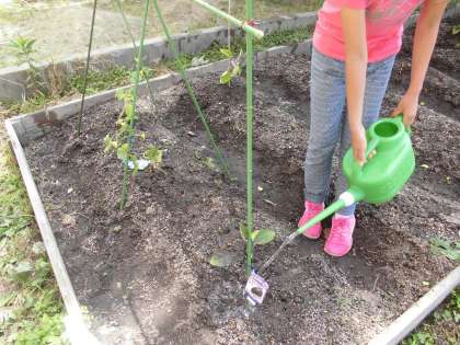 そろばんの先生にいただいた野菜の苗に水やりをしています。