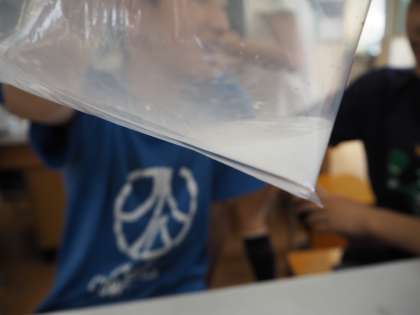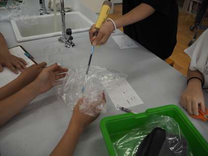 石灰水や気体検知管を使って調べました。器具の操作も手慣れたものです。