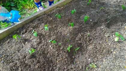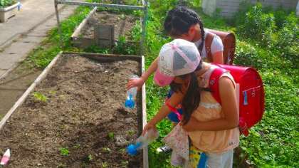 2年生が南館の南側の学校園で育てているミニトマトに水をやっていました。2年生はこのほかにも,えだ豆,ししとう,インゲン,なす,ピーマン,オクラを育てています。夏に向けて成長が楽しみです。