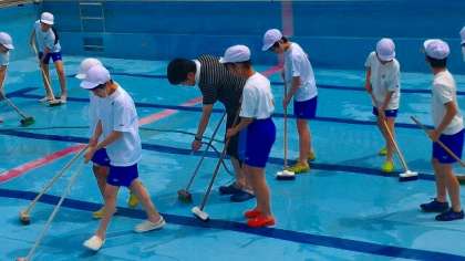 来週からの水慣れ・水遊びや水泳学習を前に,5,6年生がプール掃除をしました。写真は2校時に6年生がプールをきれいにする様子です。