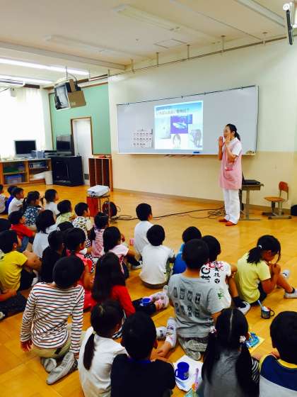 今日の2校時に生活科ルームで1年生の歯磨き指導がありました。歯科衛生士の方に来ていただき,6歳臼歯についてお話していただいた後,歯磨きのしかたを教えていただきました。今日からおうちで実践してほしいと思います。