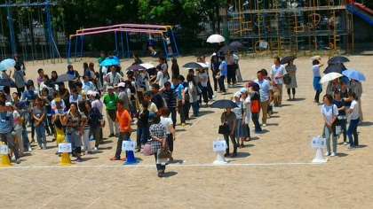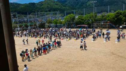6月18日の12時より運動場で引き渡し訓練を実施しました。震度5弱以上の地震が派生した場合,保護者のみなさんに学校に迎えに来ていただき,児童を引き渡します。この日は,教室での一時避難のあと,学校長がお話をし,その後まず保護者のみなさんに運動場へ移動していただきました。