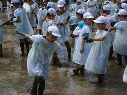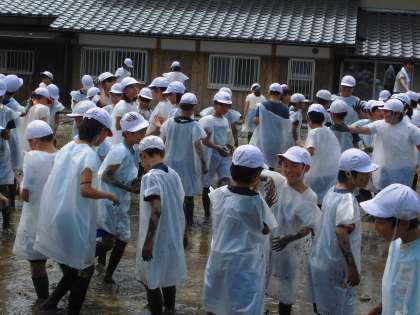 5年生は米作りにチャレンジします。地域の農家の方のご協力により,明日田植えをします。田植えを前に,今日の午前中にあぜぬりをしました。