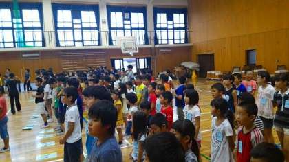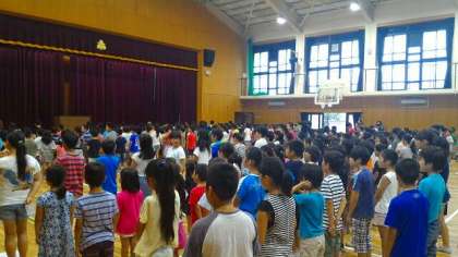 7月12日(火),1時間目が始まる前に児童集会を行いました。たてわりグループ後にと集まり,初めに児童会の歌を歌いました。