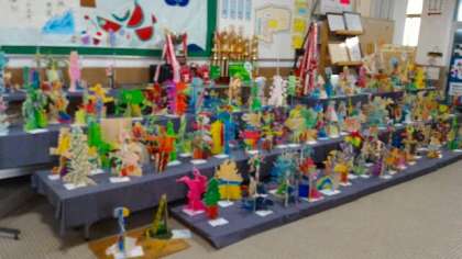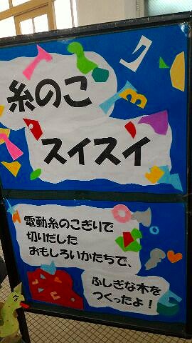 電動糸のこぎりを使って作品作りをしました。ひとりひとりが不思議な木を作りました。正面玄関を入ったところに展示しています。ご来校の際に,ご覧ください。