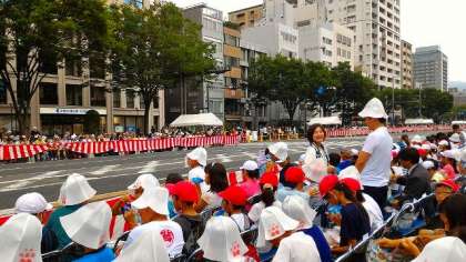 7月17日(日)の祇園祭山鉾巡行観覧に4,5年生の児童がご招待いただきました。学校を出発するころは雨が降っていましたが,河原町二条でバスを降りるころには,雨もあがりました。