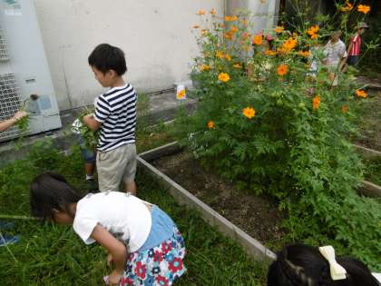 はじめに,夏休み前に観察した,ほうせんか・おじぎそう・こすもす・ふうせんかずらの様子を見に行きました。すっかり大きくなって,花も咲いていました。みんな,「花がいっぱいさいてる。」「めっちゃきれいやな。」と喜んでいました。みんなで,草引きも頑張りました。