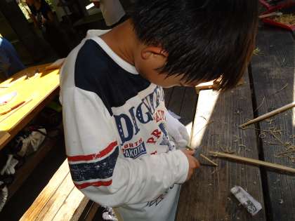食堂での昼食後,第一炊飯場にて竹ばしづくりを行いました。