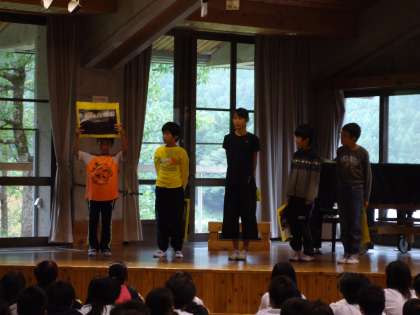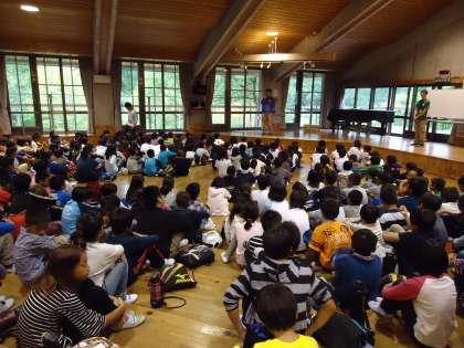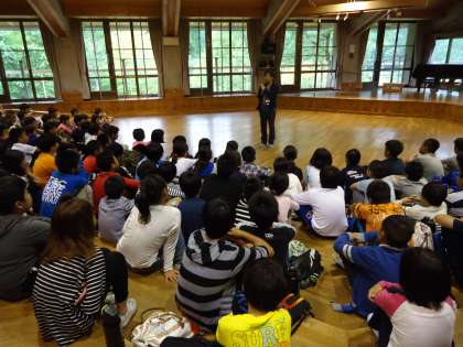 花脊山の家の職員の方から自然についてのお話を聞いたり,それぞれの学校で学校紹介を行ったりしました。
