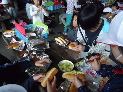 パンにキャベツとソーセージをはさみ,アルミホイルで包んでいます。