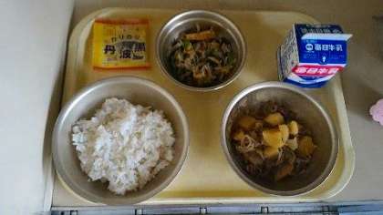 こまつなときりぼしだいこんのにびたし,牛乳,にくじゃが,むぎごはん,くろだいずでした。