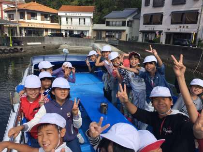 賢島から英虞湾をわたり,深谷水道に入ります。船の上から,真珠の養殖場やトビウオも見えます。