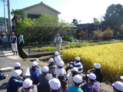 17日(火)の午前中に稲刈りを行いました。6月に田植えをしましたが,その後,地域の方々のおかげで立派な稲に成長していました。
