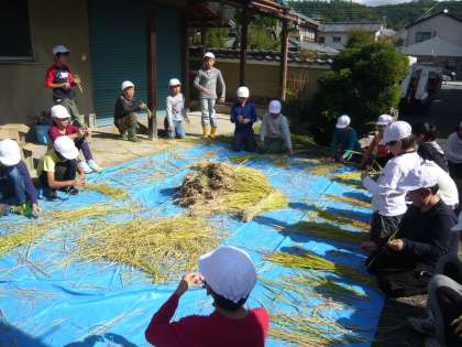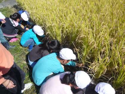子どもたちは,始めは慣れないので困ることもありましたが,作業に慣れてくると,それぞれのグループでスムーズに作業を行うことができました。しかし,時間が経つと,段々と疲れが出てきます。稲刈りがどれだけ大変な作業かを身をもって実感していました。同時に毎日おいしく食事ができることに感謝していました。その日の給食は,いつも以上に感謝して食べようという気持ちが子どもたちから伝わってきました。