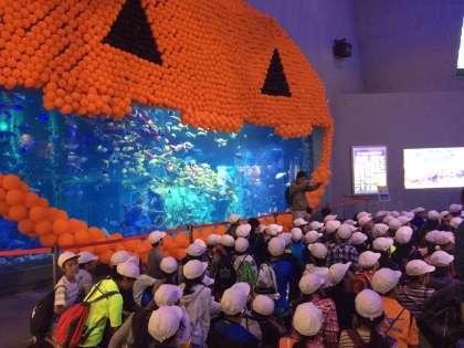 鳥羽水族館に着きました。水槽がハロウィン仕様になっていて、子どもたちも喜んでいます。
