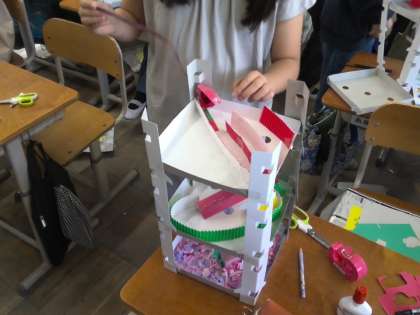 ビー玉が下まで行へ転がることができるよう、道や仕掛けを作ったり、転がりやすい道を考えながら、アイデア溢れる世界観の作品ができました。