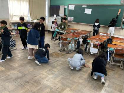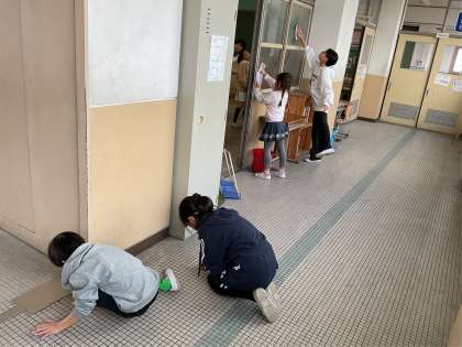 たてわりグループで「無言清掃」に取り組んでいます。ペアで協力して黙々と掃除をしていました。
