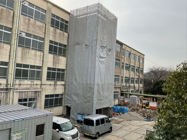 中庭には高い足場が組まれています。体育館前も、だんだんと様子が変わってきました。