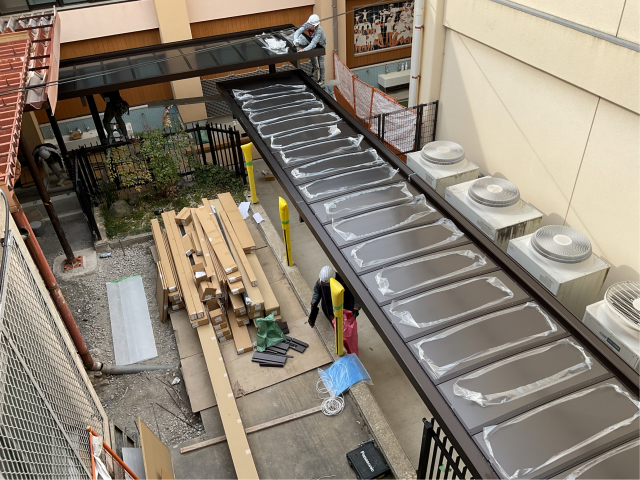 中庭のエレベーターと体育館前のスロープ工事が着々と進んでいます。