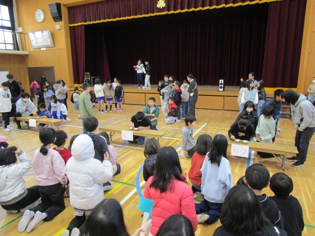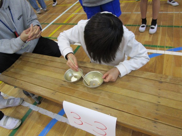 今日から給食週間が始まりました。正しいお箸の持ち方・使い方ができるようになってほしいので、各クラスで練習して代表を決めて「豆つまみリレー大会」を行いました。担任の先生もアンカーとして参加され、応援者もクラスが一致団結して頑張りました。これからも正しいお箸の持ち方できれいに食べられると嬉しいです。中学年の優勝は、4年3組でした。