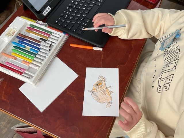 国語科「ものの名まえ」の学習では、様々な物の名前には、「りんご・バナナ」などの一つ一つの物の名前と「果物」のようにそれら一つ一つをまとめた名前があることを学習しました。単元の終わりにはお店屋さんごっこをします。この日はお店で売るカードを描きました。GIGA端末でWeb上の図鑑を調べて、絵を描きました。