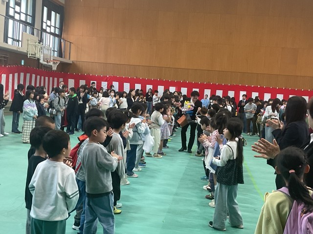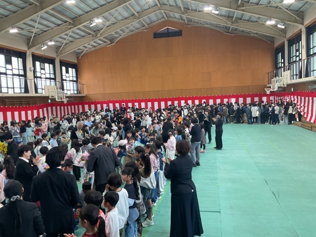 本日、令和7年度教職員離任式と管理職離任式を行いました。代表児童の言葉や花束の贈呈では、笑顔や拍手があふれ、あたたかい時間となりました。たくさんの地域や保護者の方、卒業生も参列していただきました。最後は、花道で離任される先生方を送りました。子どもたちは、さみしい気持ちもありますが、感謝の気持ちをしっかりと伝えていました。