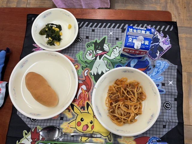今日は楽しみにしていた給食です。メニューはスパゲッティとほうれん草のソテー、コッペパン、牛乳です。給食の準備の仕方や当番になった時に着るエプロンの着方や畳み方、配膳の仕方などたくさんのことを学びました。