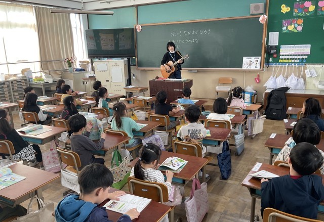 音楽の専科の先生と一緒に学習をしました。「にじ」「ありがとうのはな」を、ギターの伴奏に合わせて元気よく歌っていました。