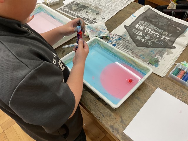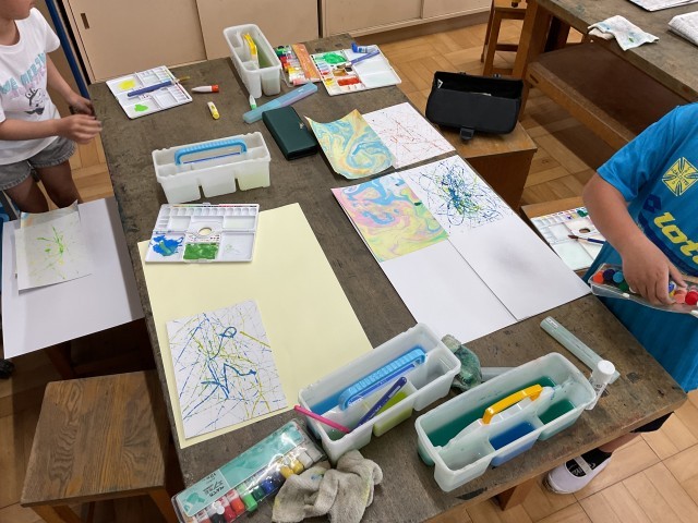 マーブリングやスパッタリング、吹き流しなど様々な技法を使って自分だけの模様づくりを楽しんでいました。
