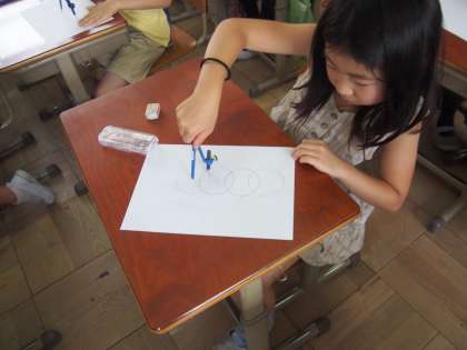 初めてコンパスを使う子も多く,ぴったりと円が描けたときは,